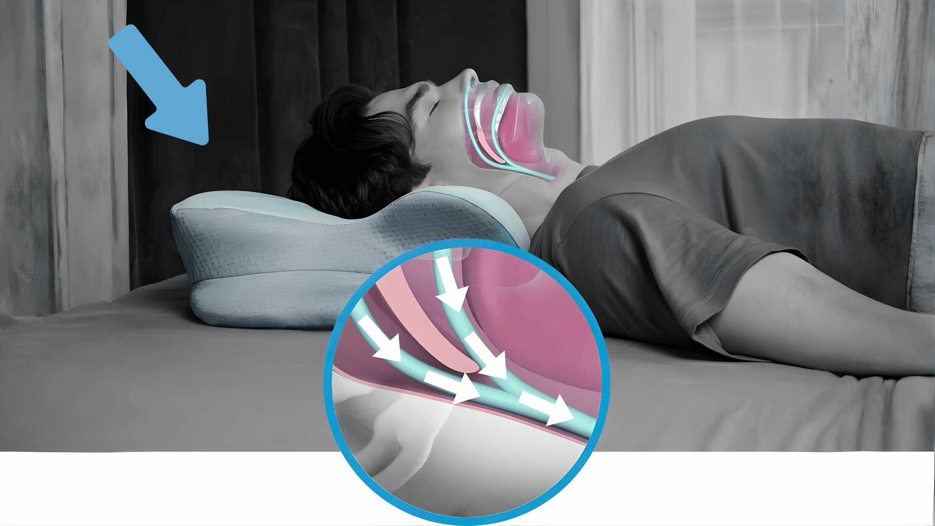 Wenn du auf einem normalen Kissen schläfst, ohne die richtige Unterstützung, verkrümmt sich deine Halswirbelsäule – und drückt deinen Atemweg zu, wie ein Gartenschlauch, der die ganze Nacht eingeklemmt wird.